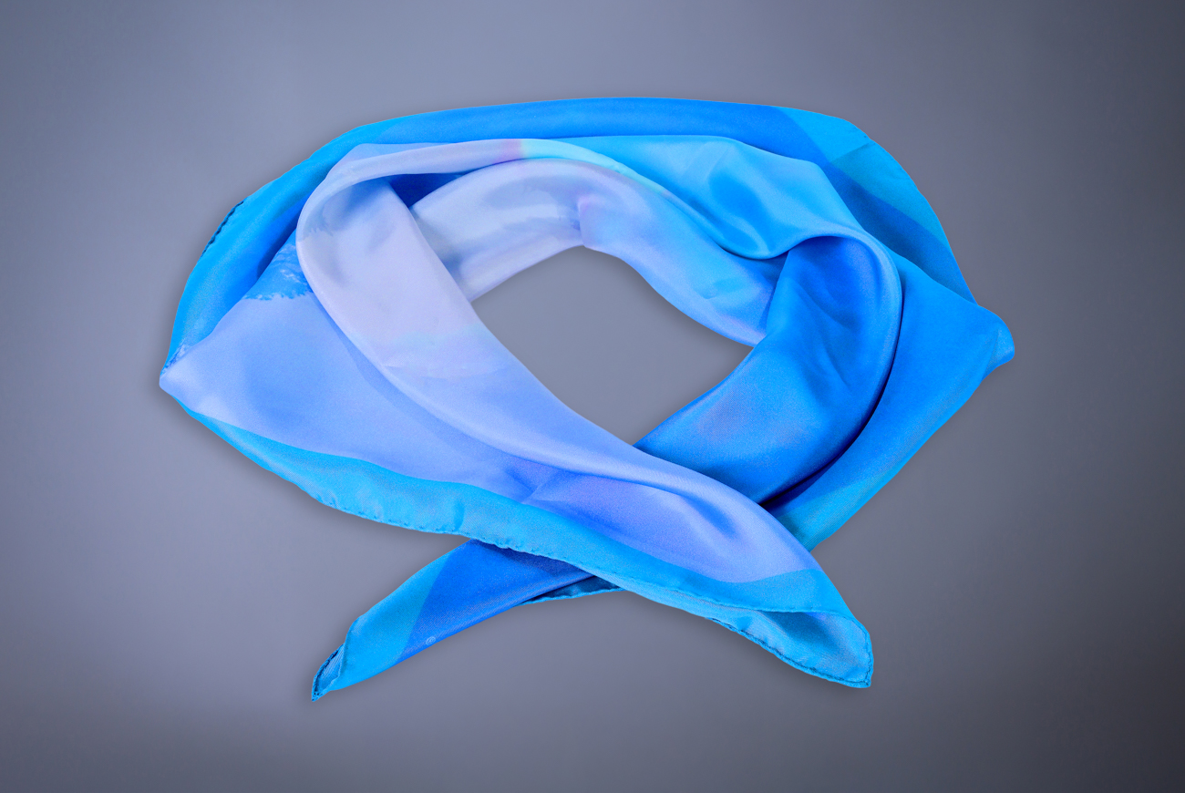 Light and deeper turquoise, clear shades of blue and radiant white create a dynamic, mysterious expression of nature in this luxurious silk scarf — exuding a confident presence.