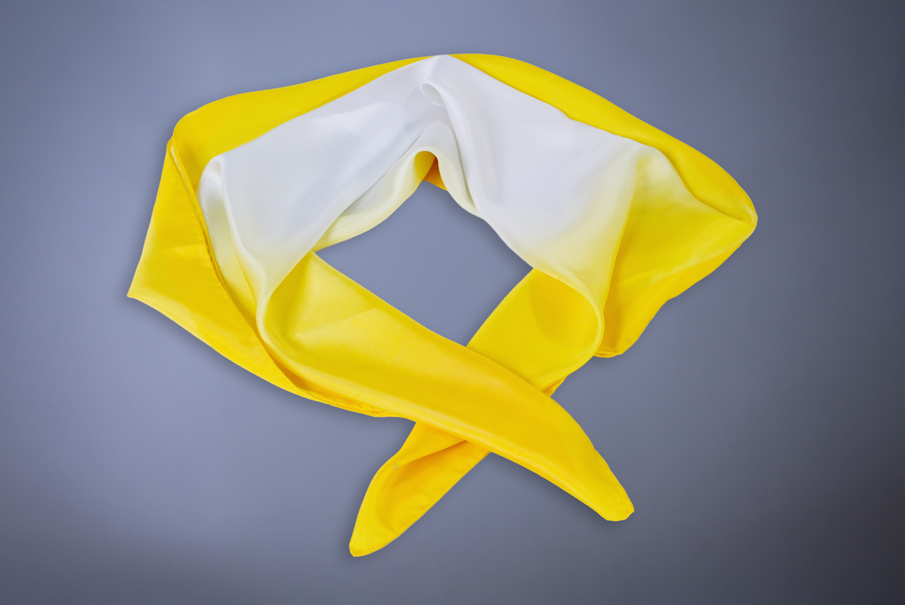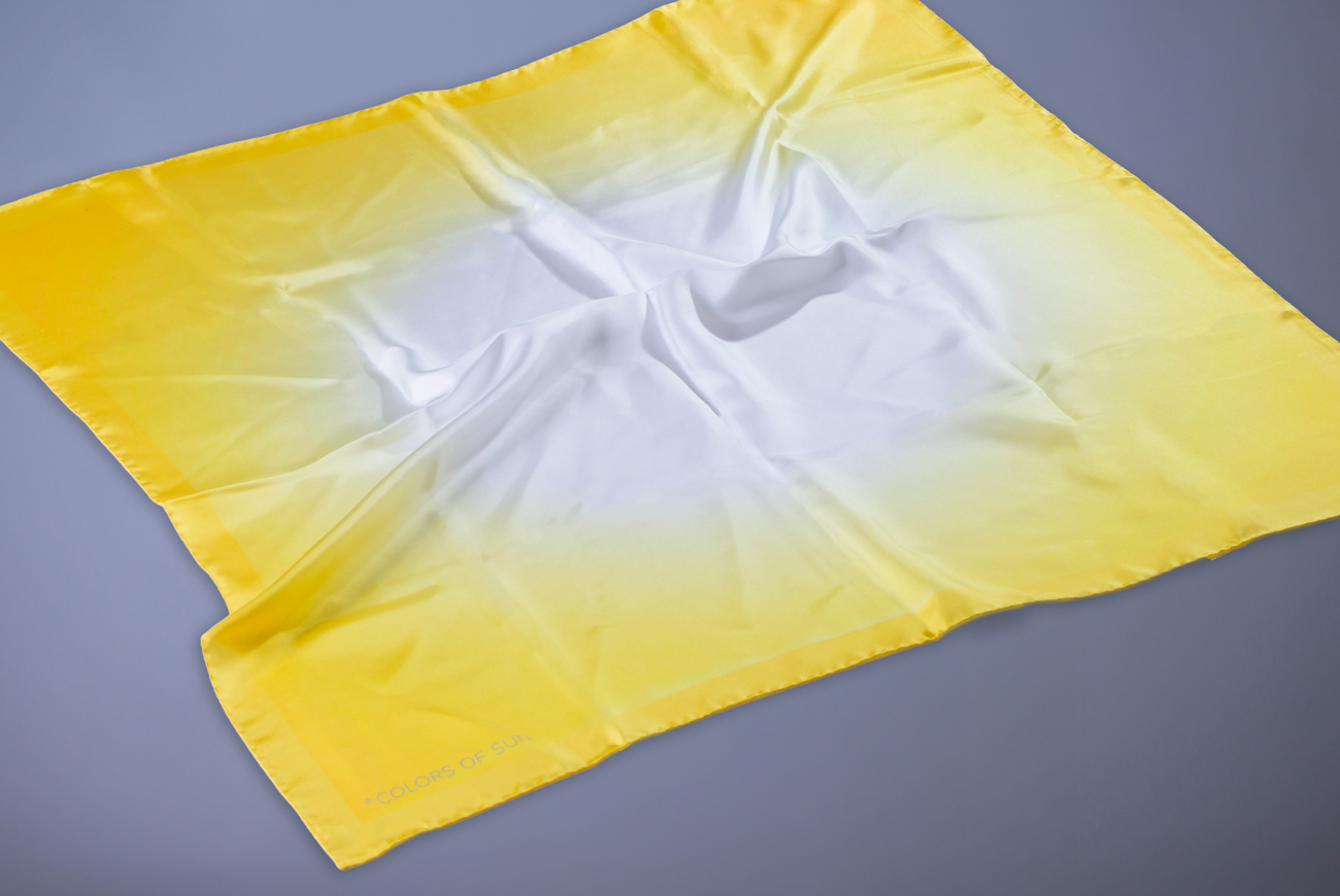 The radiant yellow and white in this luxurious silk scarf appear powerful and refined, glowing with a positive brilliance — a truly striking effect.
